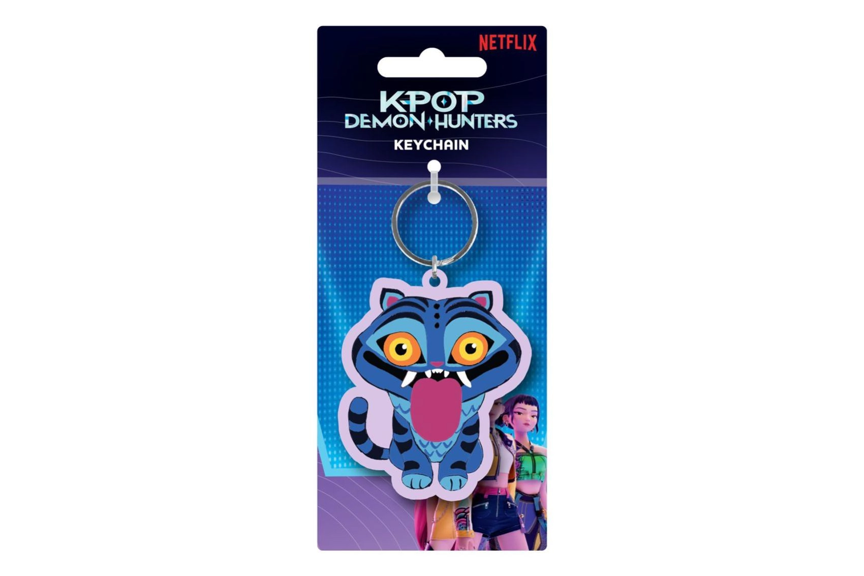 Stilīgs atslēgu piekariņš ar oficiālo Netflix licenci, iedvesmots no sērijas K-pop Demon Hunters. Izgatavots no mīkstas un elastīgas gumijas, ar metāla riņķīti ērtai piestiprināšanai pie atslēgām, mugursomas vai somiņas. Ievērojams zilā tīģera dizains ar oranžām acīm un zīmēto stilu nodrošina, ka tas izcelsies kā merčs faniem un kolekcionāriem.