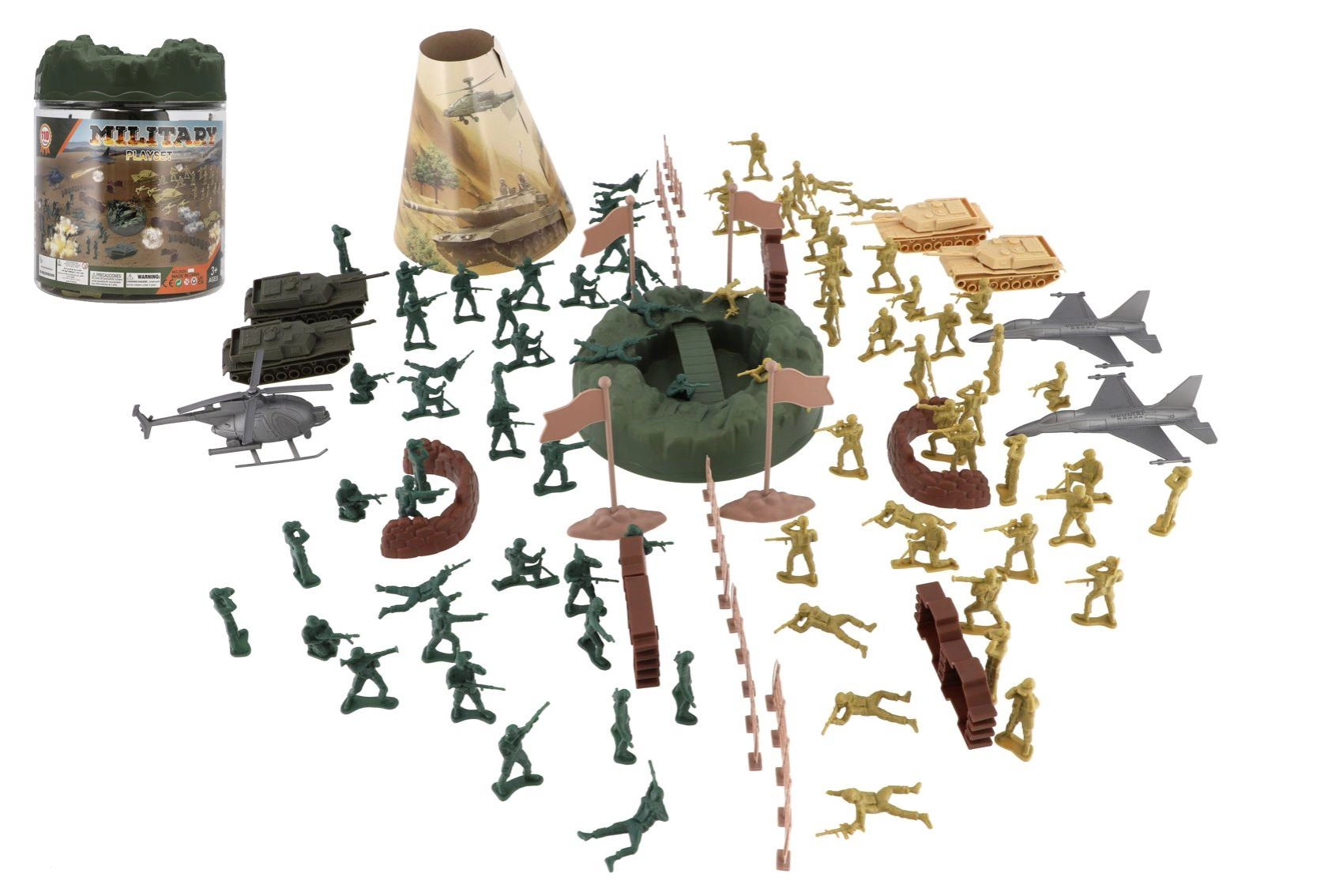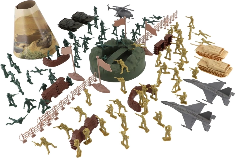 Apjomīgais militārais komplekts piedāvā visu, kas bērniem nepieciešams, lai radītu aizraujošas kauju ainas. Tajā atradīsiet plastmasas kareivjus vairākās pozās, tankus, lidmašīnas un helikopterus, kā arī žogus, barikādes, karogus un reljefa elementus. Pateicoties bagātīgajam aprīkojumam, var viegli būvēt bāzes, plānot virzību un attīstīt stratēģiju.