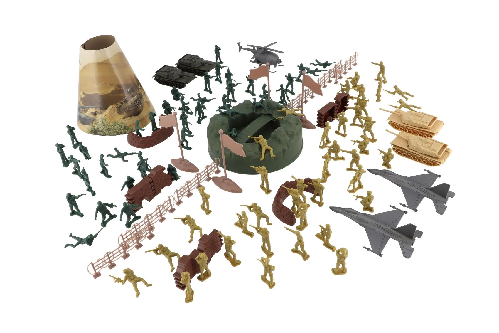 Komplekts ar kareivjiem, tankiem, lidmašīnām, helikopteriem un piederumiem ļauj bērniem veidot savus kaujas laukus un attīstīt stratēģisko domāšanu.