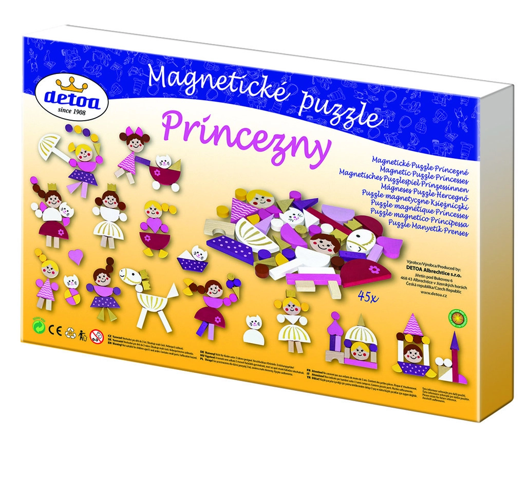 Detoa magnētiskās puzles par princesēm sniedz stundām ilgu radošu nodarbi. Bērni var kombinēt krāsainus koka gabaliņus ar magnētu un veidot savus tēliņus, dzīvniekus un mazus piļu ansambļus. Magnētiskā tāfele droši notur visu vietā, savukārt stendiņš ļauj gatavos darbiņus skaisti izlikt.