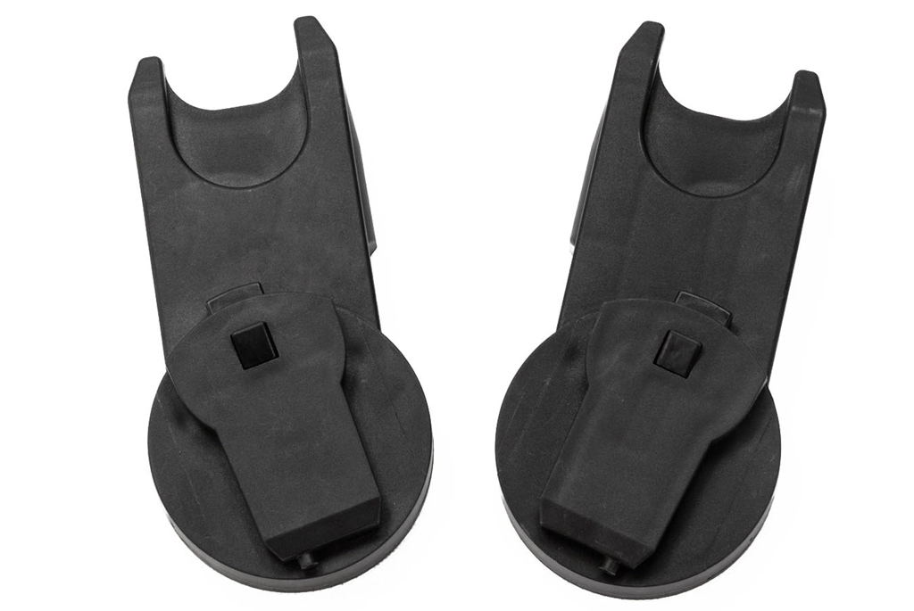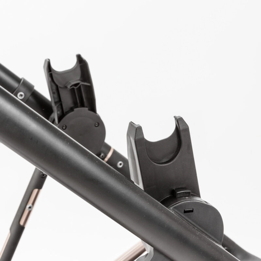Ievietojiet adapterus ratiņu rāmja montāžas atverēs, līdz tie nofiksējas ar dzirdamu klikšķi, pēc tam uzspraudiet autokrēsliņu. Pirms katras lietošanas pārbaudiet savienojuma stingrību. Demontāžai vispirms noņemiet autokrēsliņu atbilstoši tā instrukcijai un nospiediet adapteru slēdža atbrīvošanas pogu.