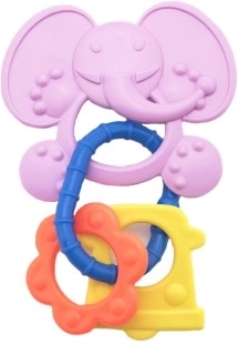 Dažādās virsmas un gredzeni maigi masē smaganas un vienlaikus izklaidē ar grabulīša skaņu.