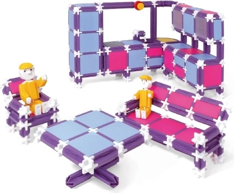 Būvkomplekts SEVA RODINA – Mājoklis piedāvā daudzveidīgas iespējas mazajiem būvētājiem. Pateicoties violetās, rozā un gaiši zilās krāsas kombinācijai, top oriģināli modeļi, kas iepriecinās ikvienu bērnu. Sastatiet ērtu “lidostu” – platu gultu, mūsdienīgu stūra virtuves iekārtu ar izlietni un iebūvētu ledusskapi, ēdamzonu, dīvānu, plauktiņus, skapīšus un parocīgas stalažas.