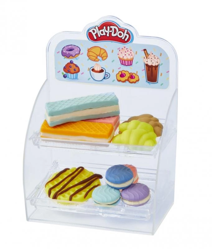 - Dzērienu ierīce ar sviru, “putukrējuma” stacija, formiņas cepumiem/cupcakes/virtuļiem, krūzītes un piederumi, caurspīdīga vitrīna, 8 Play-Doh modelēšanas masas trauciņi, kopā 20 piederumi