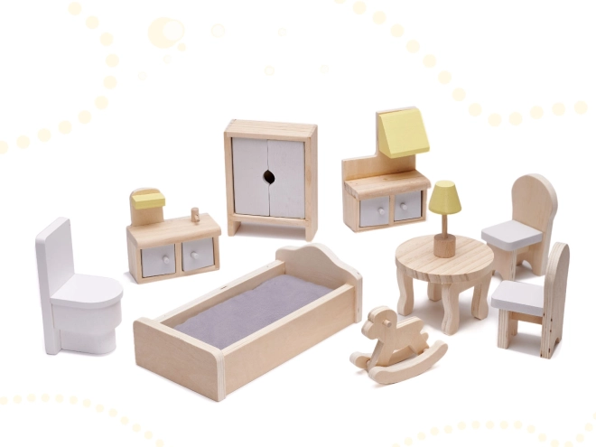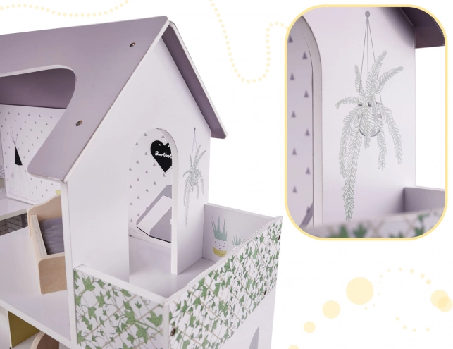 Atklājiet koka leļļu namiņa burvību, kas kļūs par katras bērnu spēles centrālo elementu. Namiņam ir trīs stāvi, un tas ir aprīkots ar stilīgu koka mēbeļu komplektu, kas piešķir katrai telpai unikālu izskatu. Izvēlieties starp dārzu, virtuvi, guļamistabu un viesistabu, kas ir lieliski izstrādātas spēlēm ar lellēm.