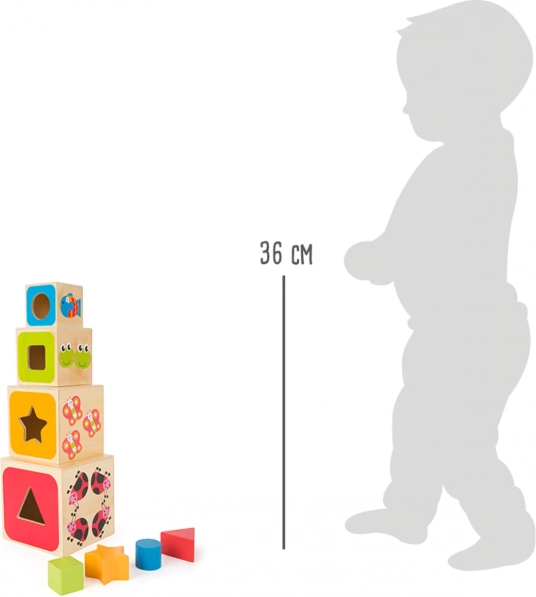 Katrš klucītis ir rotāts ar jautriem dzīvnieku motīviem un spilgtām krāsām, kas rosina izziņu. Precīzās atveres veicina pacietību un koncentrēšanos, bet torņa celšana atbalsta rokas stabilitāti un telpisko iztēli. Kvalitatīvs koka materiāls ir patīkams taustei un izturīgs ikdienas spēlēm.