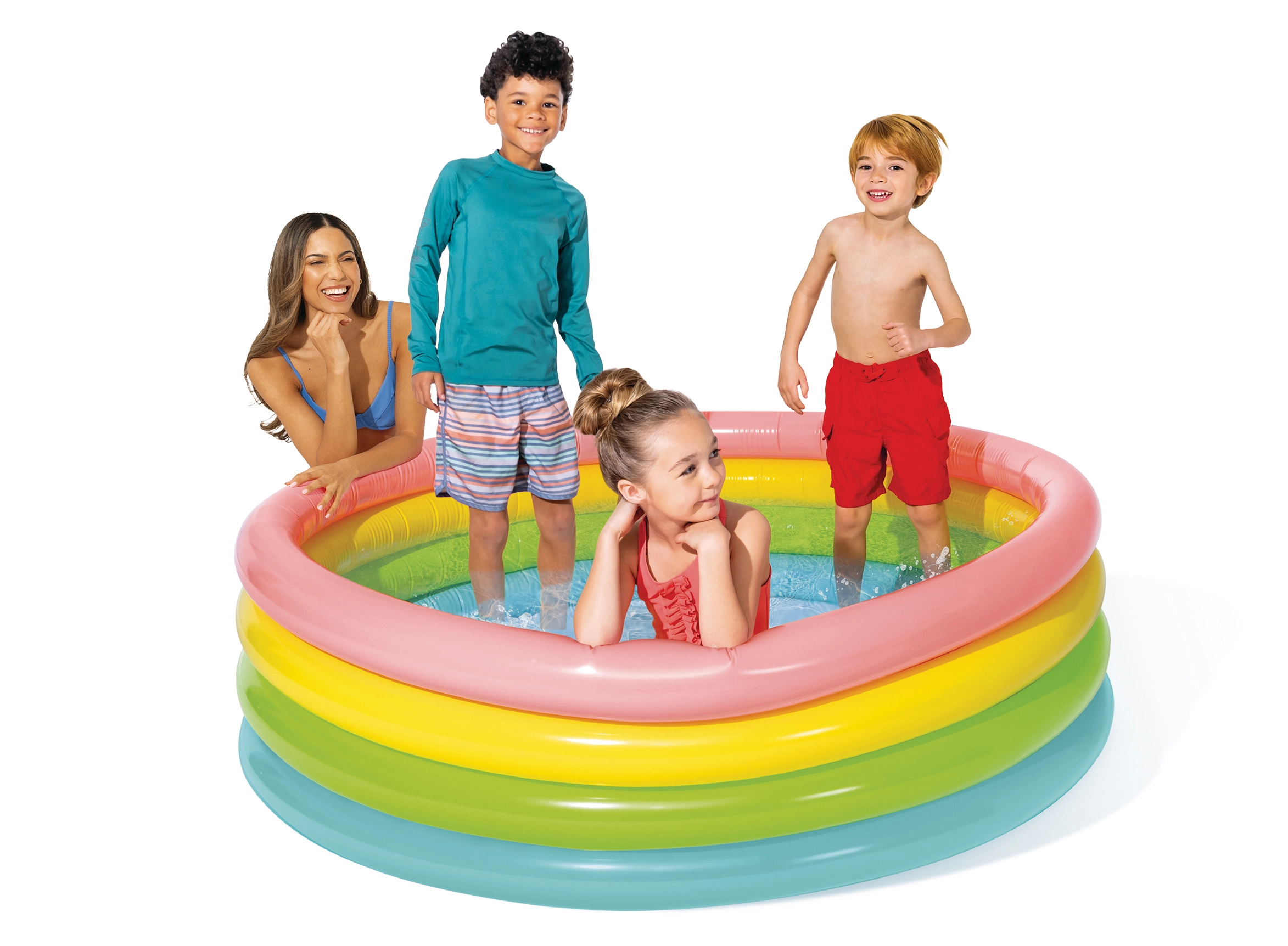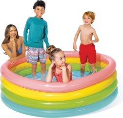 Uzstādīšana aizņem pavisam maz laika: vienkārši izklājiet uz līdzenas virsmas, piepūtiet atsevišķos gredzenus un piepildiet ar ūdeni. Krāsainais dizains aicina rotaļām un padarīs košāku jebkuru dārzu vai terasi.