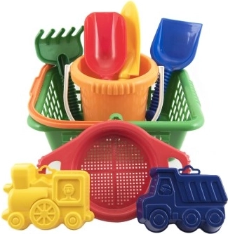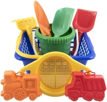 Jautrs bērnu smilšu komplekts ar praktisku grozu satur visu nepieciešamo izklaidei pludmalē un smilšu kastē: spainīti, lāpstiņu, rakti, grābeklīti, sietiņu un 2 formiņas. Viegls un izturīgs plastmasas materiāls ir piemērots bērniem no 12 mēnešu vecuma un veicina sīko motoriku un iztēli.