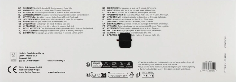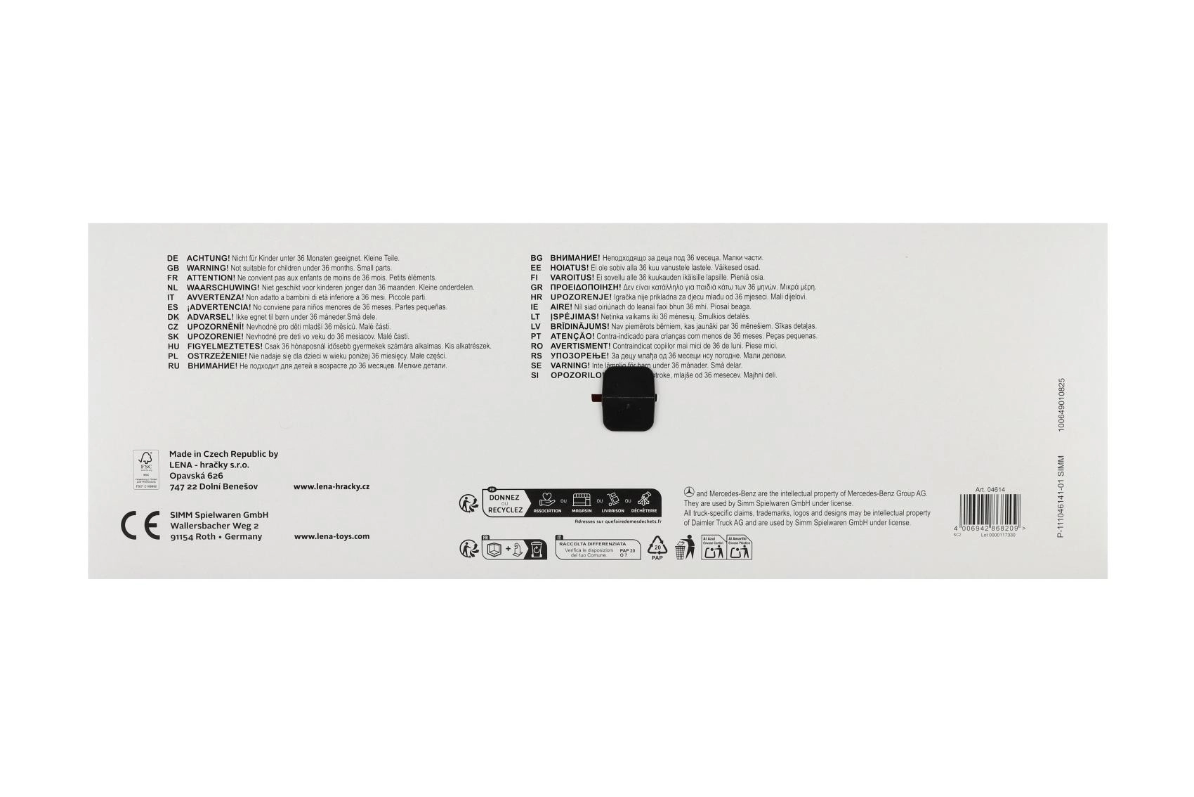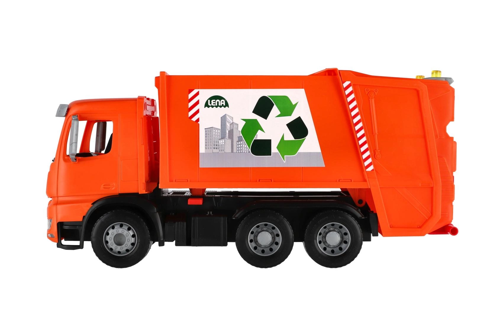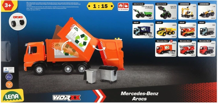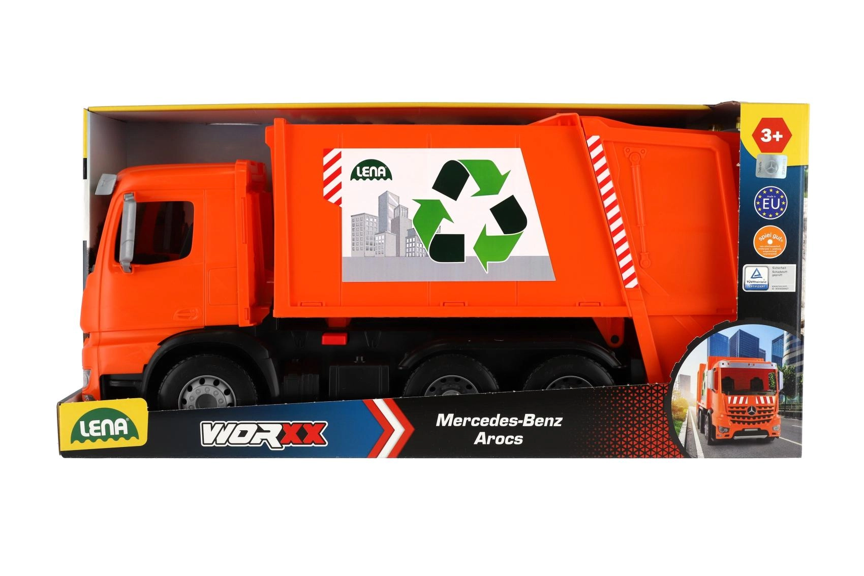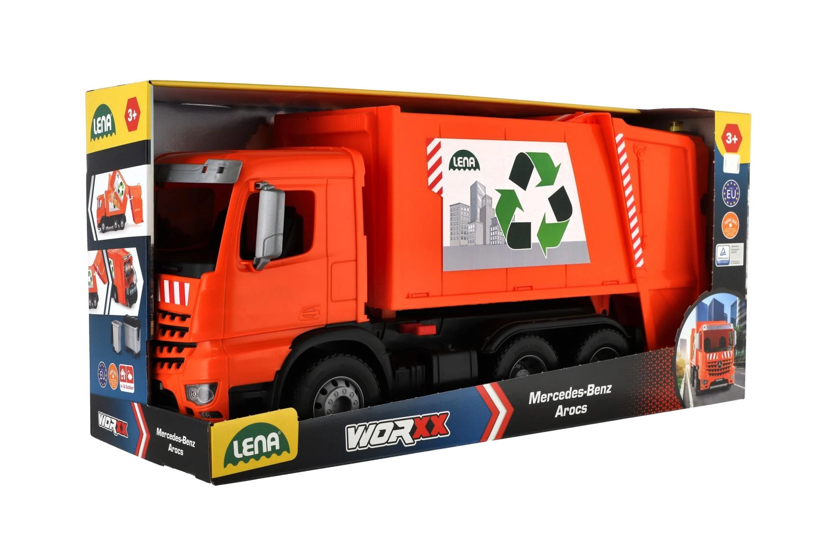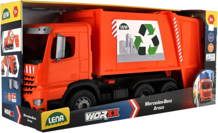 Oranžais atkritumu savācēja auto MERCEDES AROCS no zīmola LENA sniedz bērniem realistisku atkritumu savākšanas spēli. Piedāvā izturīgu plastmasas konstrukciju, stingras metāla riteņu asis, drošības fiksatoru pret nevēlamu izkraušanu un divus konteinerus vēl jautrākai spēlei. Lieliski piemērots iztēles attīstīšanai, koordinācijai un smalkajai motorikai mājās un dārzā.