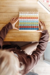 Mācības norit rotaļīgā formā – bērni ņem atsevišķus gabaliņus ar uzdevumiem, meklē pareizos risinājumus un ievieto tos atpakaļ režģī. Pateicoties pārskatāmai krāsu kodēšanai un praktiskajam koka rāmim, viss ir glīti sakārtots.