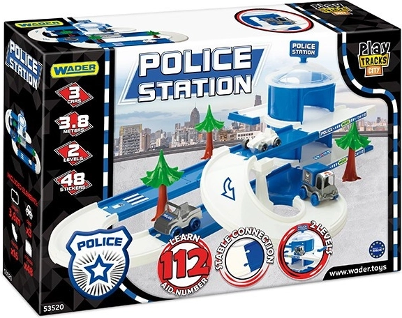 Izklaidējošā Wader Play Tracks City policijas stacija bērniem no 1 gada piedāvā dinamiskas braucienus pa daudzlīmeņu trasi 3,8 m garumā. Komplektā ietilpst divstāvu stacija, 3 Kid Cars policijas mašīnītes (patruļauto, furgons, džips) un dekorācijas ar uzlīmēm. Pateicoties vienkāršai montāžai un drošam, izturīgam plastmasas materiālam, rotaļlieta attīsta iztēli un sīko motoriku un ir lieliska dāvana.