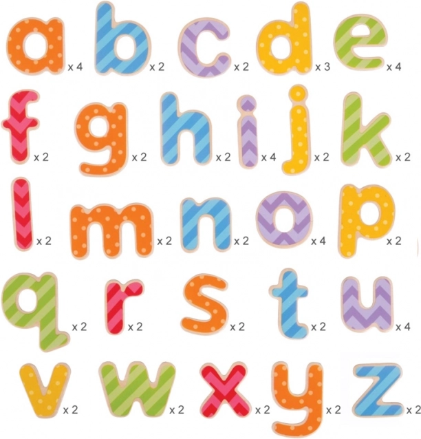 Komplektā ir 63 detaļas, kas ļauj bērniem apgūt burtus rotaļīgā un saistošā veidā.