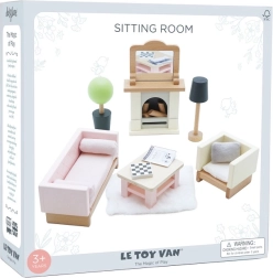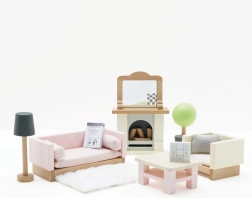 Komplektā ir 19 daļas: dīvāns un krēsls ar tekstila spilveniem, kafijas galdiņš, kamīns ar malku un spoguli, paklājs, puķe podā un lampa. Izmēra ziņā tas ir piemērots Le Toy Van leļļu mājiņām. Papildu Daisylane līnijas mājiņu aksesuāri pieejami mūsu vietnē.