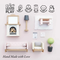 Pēc dienas, kas pilna rotaļu, figūriņas atpūtīsies šajā skaistajā viesistabā, kas iedvesmo bērnus rotaļām un attīsta viņu iztēli. Viesistabas aprīkojums ir dekorēts ar netoksiskām krāsām un izgatavots no FSC® koksnes, kas kalpos bērniem paaudzēm.