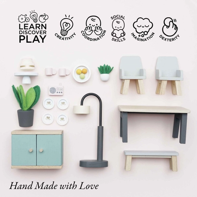 Šis burvīgais ēdamistabas komplekts ir izgatavots no augstas kvalitātes FSC sertificētas koksnes un piešķir jebkurai leļļu mājiņai izsmalcinātības pieskārienu. Komplektā 18 elementi, tostarp galds, divi krēsli, sols, lampa, kumode un dekoratīvi aksesuāri, piemēram, augi, augļu trauks un torte. Komplektam ne vien ir skaists izskats, bet tas arī veicina bērnu izziņas un komunikācijas prasmes. Tas ir dekorēts ar netoksiskām, uz ūdens bāzes gatavotām krāsām un ir saderīgs ar citiem Le Toy Van Dolls mājiņu komplektiem.