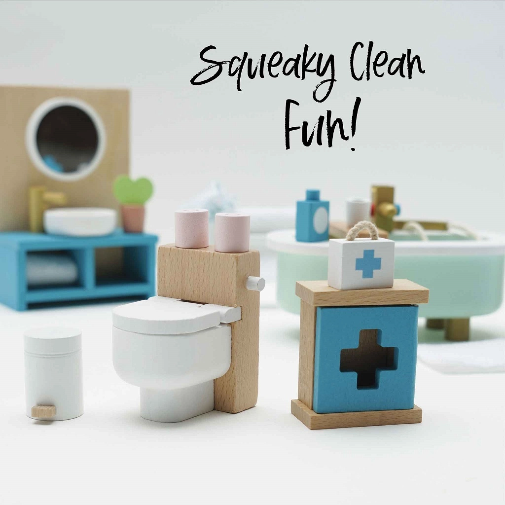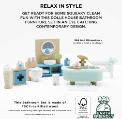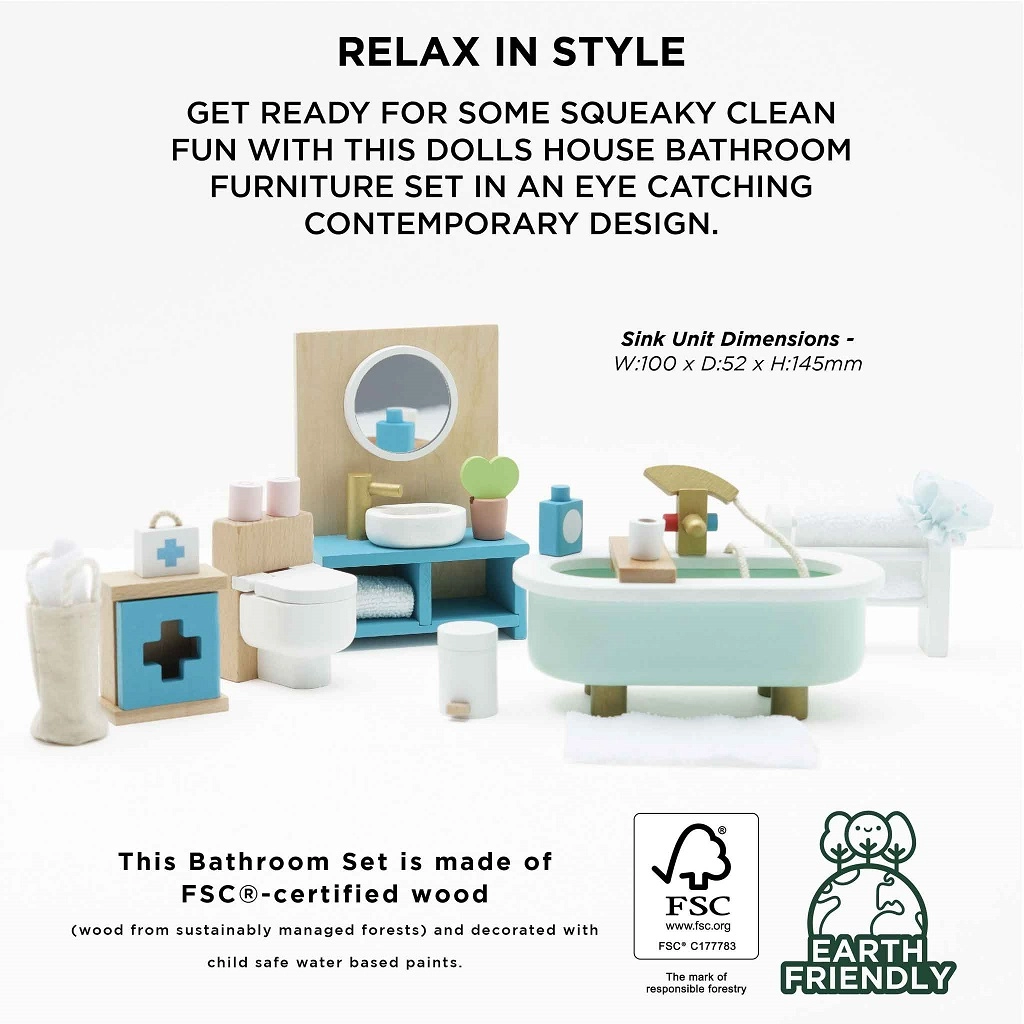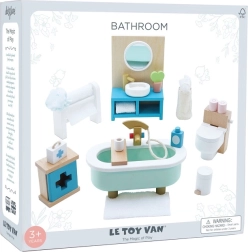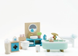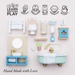 Stilīgs vannasistabas mēbeļu komplekts leļļu mājai mērogā 1:12 no zīmola LE TOY VAN. Iekļauta vanna, tualete, izlietne, dvieļu pakaramais un aptieciņa, roku darbs ar netoksiskām, uz ūdens bāzes gatavotām krāsām. Ražots ētiski no ilgtspējīgiem materiāliem, veicina radošu spēli, komunikācijas prasmes un koordināciju.