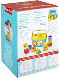 Desmit koši krāsaini gabaliņi un vāks ar izgriezumiem palīdz bērniem dabiski atšķirt formas un krāsas ikreiz, mēģinot ievietot pareizo formu pareizajā atverē.