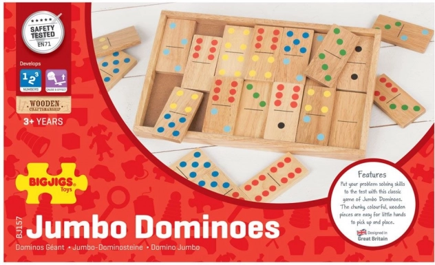 Jumbo koka domino ir perfekti pielāgoti mazajiem bērniem, kuri viegli tiek galā ar kauliņu pacelšanu un novietošanu. Galvenās šīs spēles priekšrocības ietver: