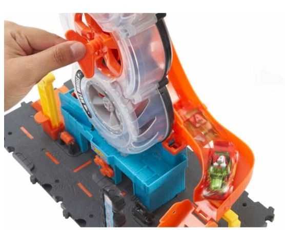 Šis spēļu komplekts ir pilnībā savietojams ar citiem Hot Wheels komplektiem, ļaujot bērniem izveidot savu sacīkšu un triku pasauli. Komplektā ir iekļauta viena automašīna, taču vienlaikus pa riepu struktūru var kustēties līdz četrām automašīnām, kas garantē bezgalīgu jautrību.