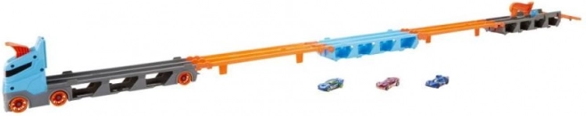 Izbaudiet ātru sacīkšu satraukumu! Pateicoties svirai trases beigās, pirmais auto var pabeigt sacīksti, kamēr otrs apstājas. Sacīkšu pārvadātāju var savienot ar citām Hot Wheels City spēļu komplektu trasēm (pārdod atsevišķi), ļaujot izveidot savu sacīkšu maršrutu.