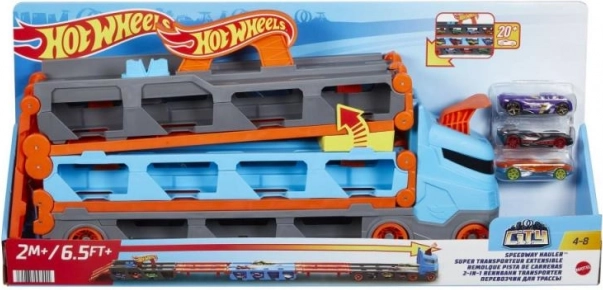 Ar Hot Wheels sacīkšu pārvadātāju 2‑vienā jūs varat viegli uzglabāt un izstādīt līdz 20 mašīnītēm, pateicoties mazajiem lodziņiem piekabē. Kad pienāk sacīkšu laiks, pārvadātājs, to izklājot, pārvēršas par 1,8 metrus garu sacīkšu trasi. Transportlīdzekļi paliek redzami zem trases, bet kravas auto kabīne pārtop par dubulto starta rampu divām mašīnām.