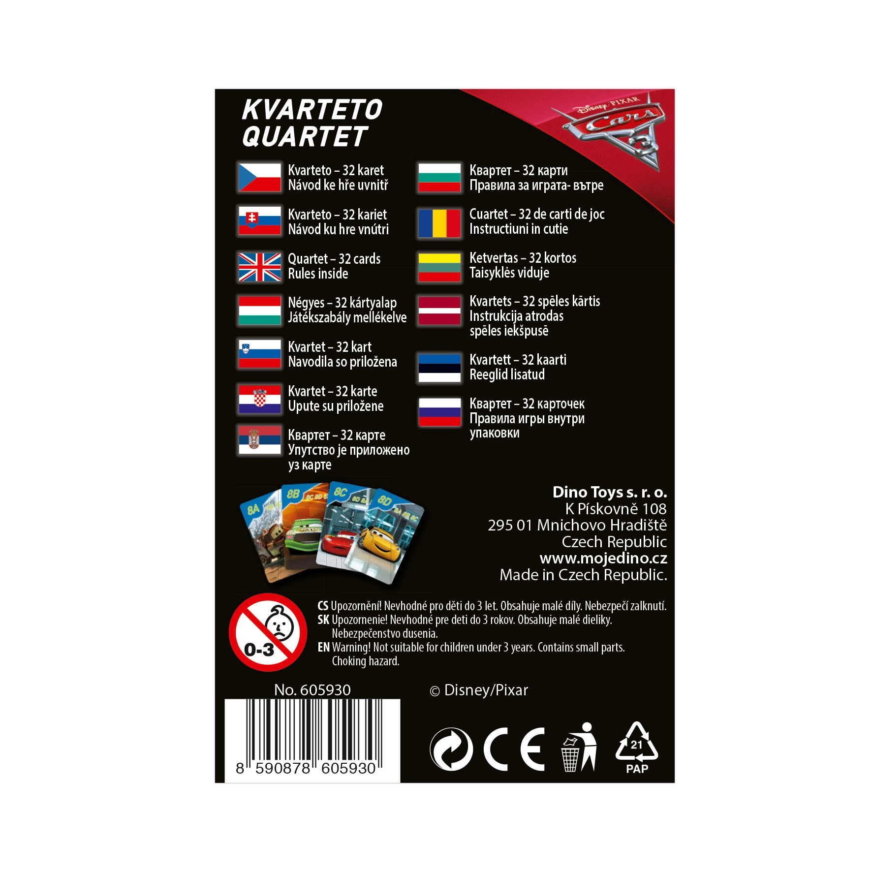 Dino kvarteta spēļu kārtis ar Cars 3 motīvu