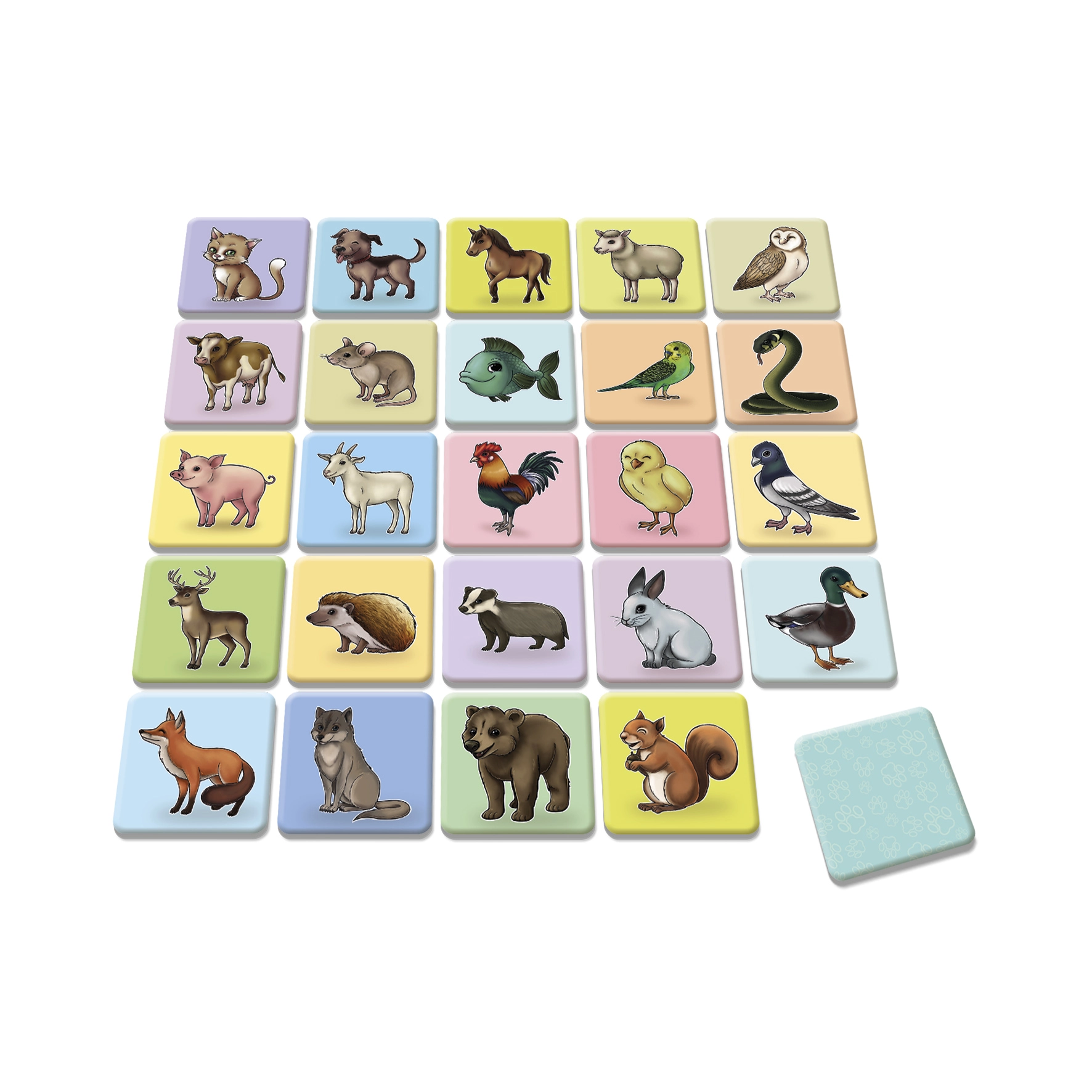 Kartonā izgatavotās kartītes rotā košas dzīvnieku ilustrācijas, kas ieinteresēs ikvienu spēlētāju.