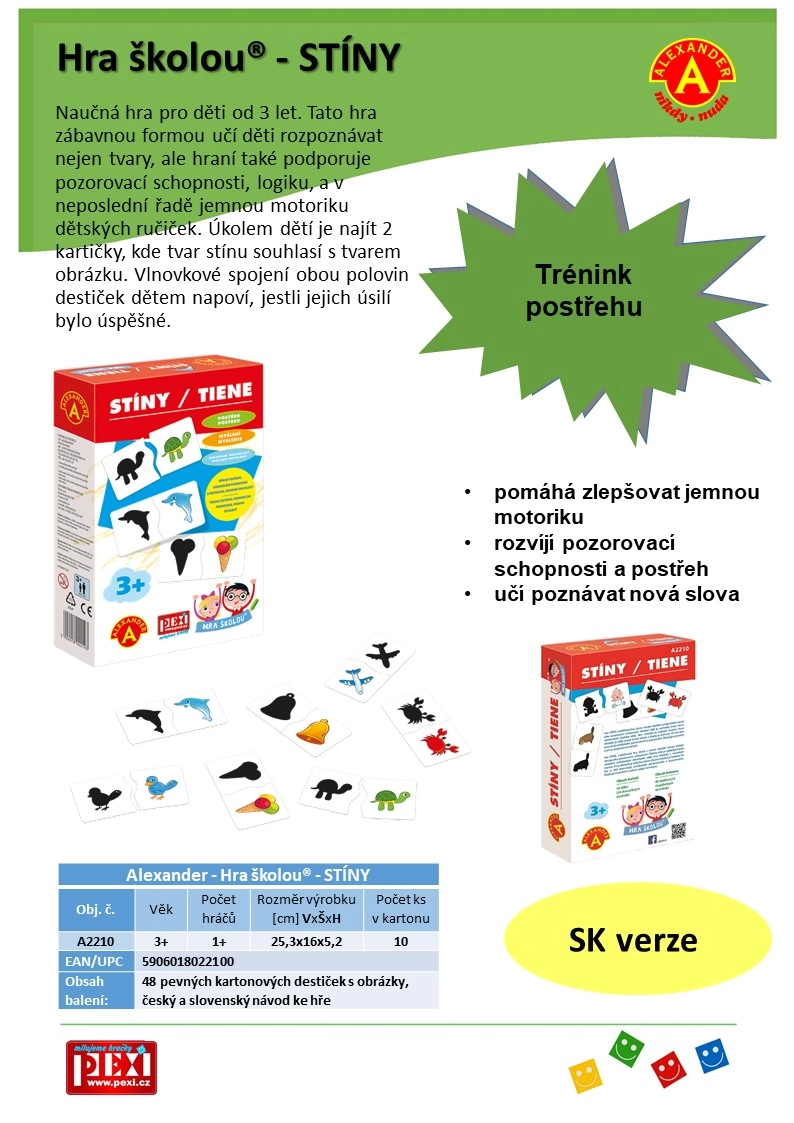 Spēle ar skolu – ēnas ir zīmēta mācību spēle, kurā bērni meklē un saliek pārus no ēnas un atbilstoša krāsaina attēla. Salieciet visus 24 pārus kā puzli, iepazīstiet formas, nosauciet dzīvniekus un mūzikas instrumentus un kopīgi par tiem parunājiet. Spēle aug līdzi bērnam – no vienkāršas piesaistes līdz ziņkārīgiem jautājumiem un sakarību meklēšanai.