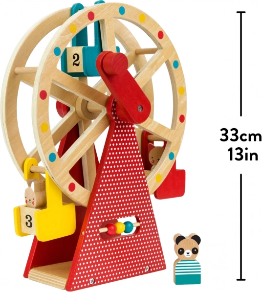 Izbaudiet stundām ilgu izklaidi ar skaisti veidoto koka panorāmas ratu no PETIT COLLAGE. Pagrieziet rokturi un vērojiet, kā lielais ritenis griežas, vizinot trīs mīļus dzīvnieku draugus no dižskābarža koka, vienlaikus attīstot sīko motoriku un koordināciju. Izturīgā konstrukcija ir krāsota ar netoksiskām, uz ūdens bāzes veidotām krāsām un lieliski papildinās jebkuru bērnistabu.