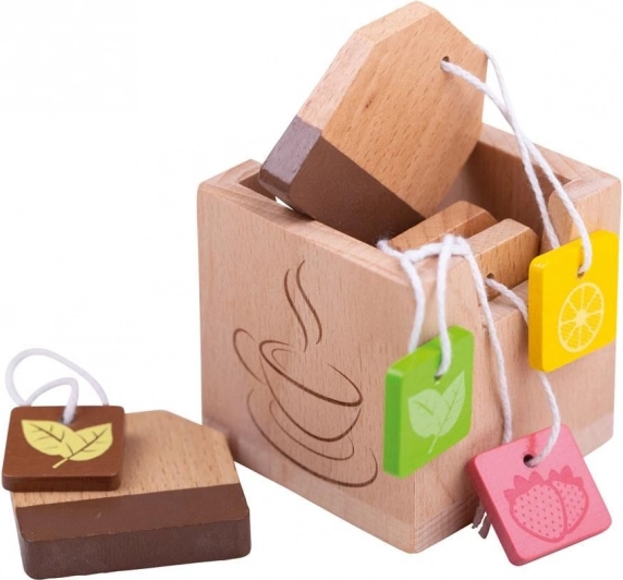 Koka tējas maisiņu komplekts ir lielisks papildinājums bērnu virtuvei vai rotaļu veikalam. Stilizētie maisiņi ar iemīļotajām garšām rosina radošu spēli un māca bērniem galda etiķeti un pieklājību, uzņemot viesus.