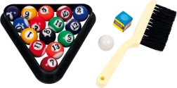 Iepakojumā ir viss, kas vajadzīgs spēles sākšanai: divi kiji, bumbas, trijstūris un krīts. Šis mini galds ir izstrādāts, lai sniegtu reālistisku pieredzi nelielā laukumā.