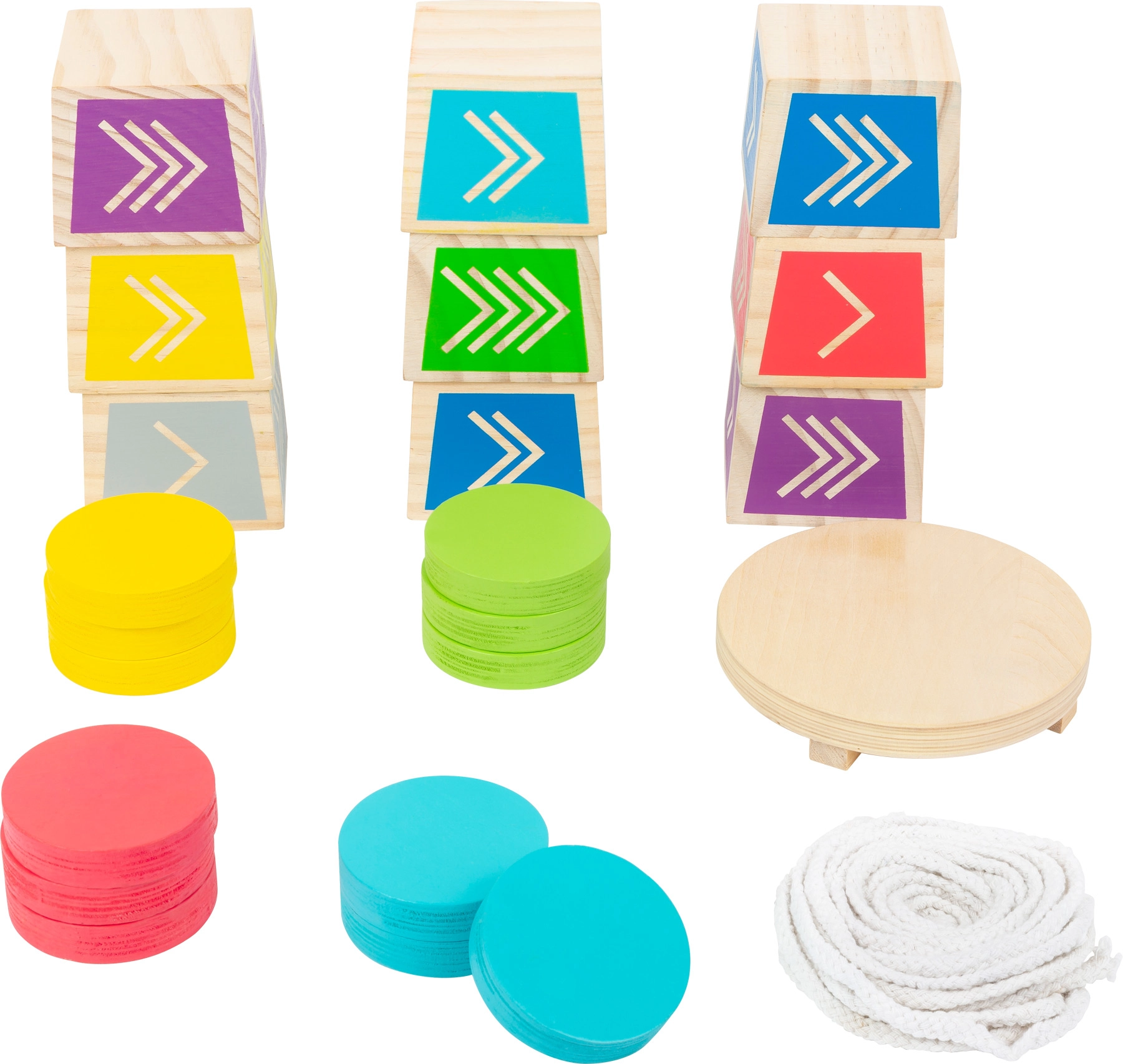 Izbaudiet dinamisku izklaidi ar ģimeni un draugiem. Šī koka prasmju spēle Kubb stilā iepriecina ar vienkāršiem noteikumiem un aizraujošu gaitu – uzdevums ir ar krāsainiem diskiem nogāzt tikai torņa augšējo kubu. Pateicoties kvalitatīvajam izpildījumam no 100% FSC koka, spēle ir izturīga, droša un videi draudzīga.