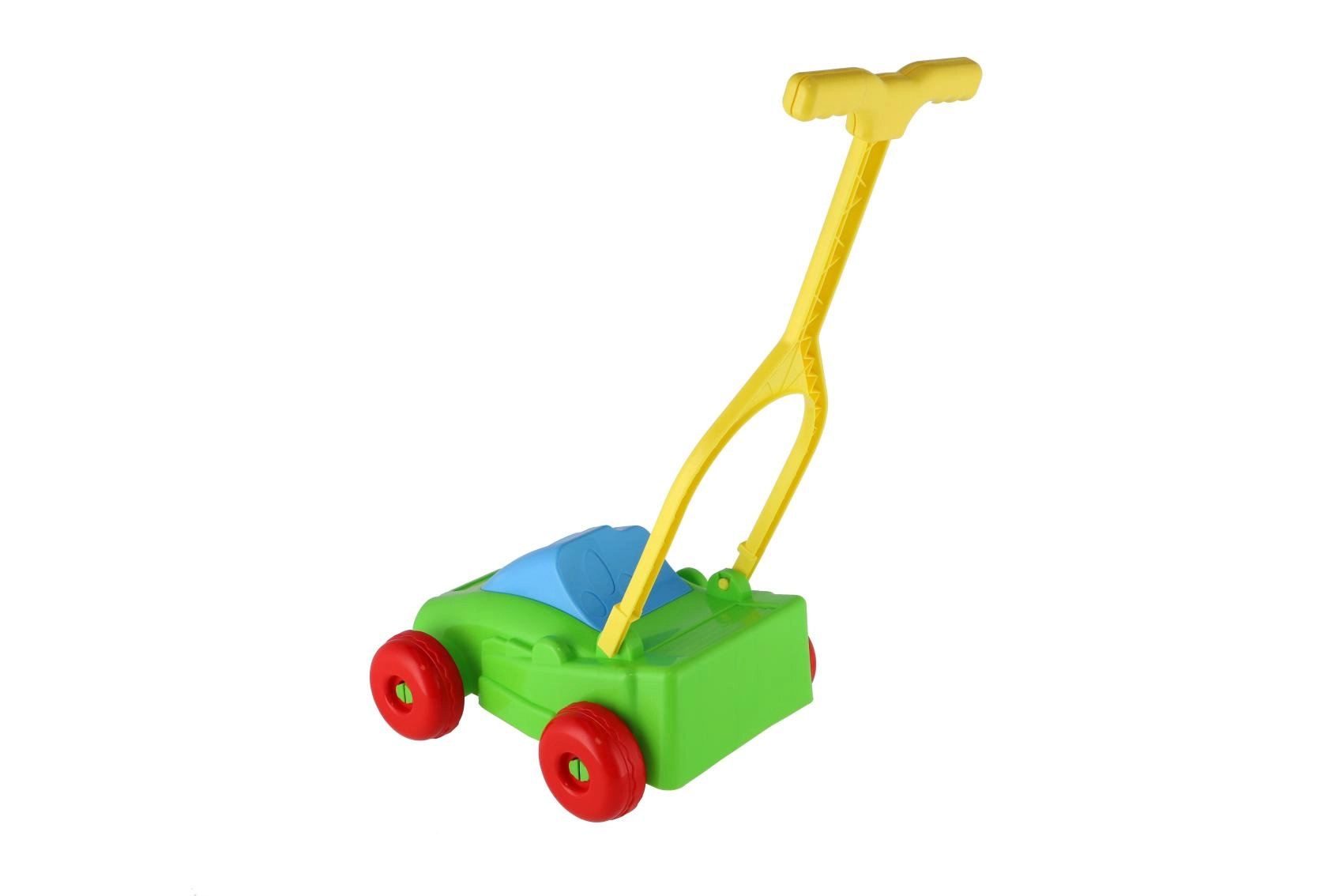 Plastmasas pļāvējs ir robusts un vienlaikus viegls, tāpēc bērni to var viegli stumt gan iekštelpās, gan ārā.