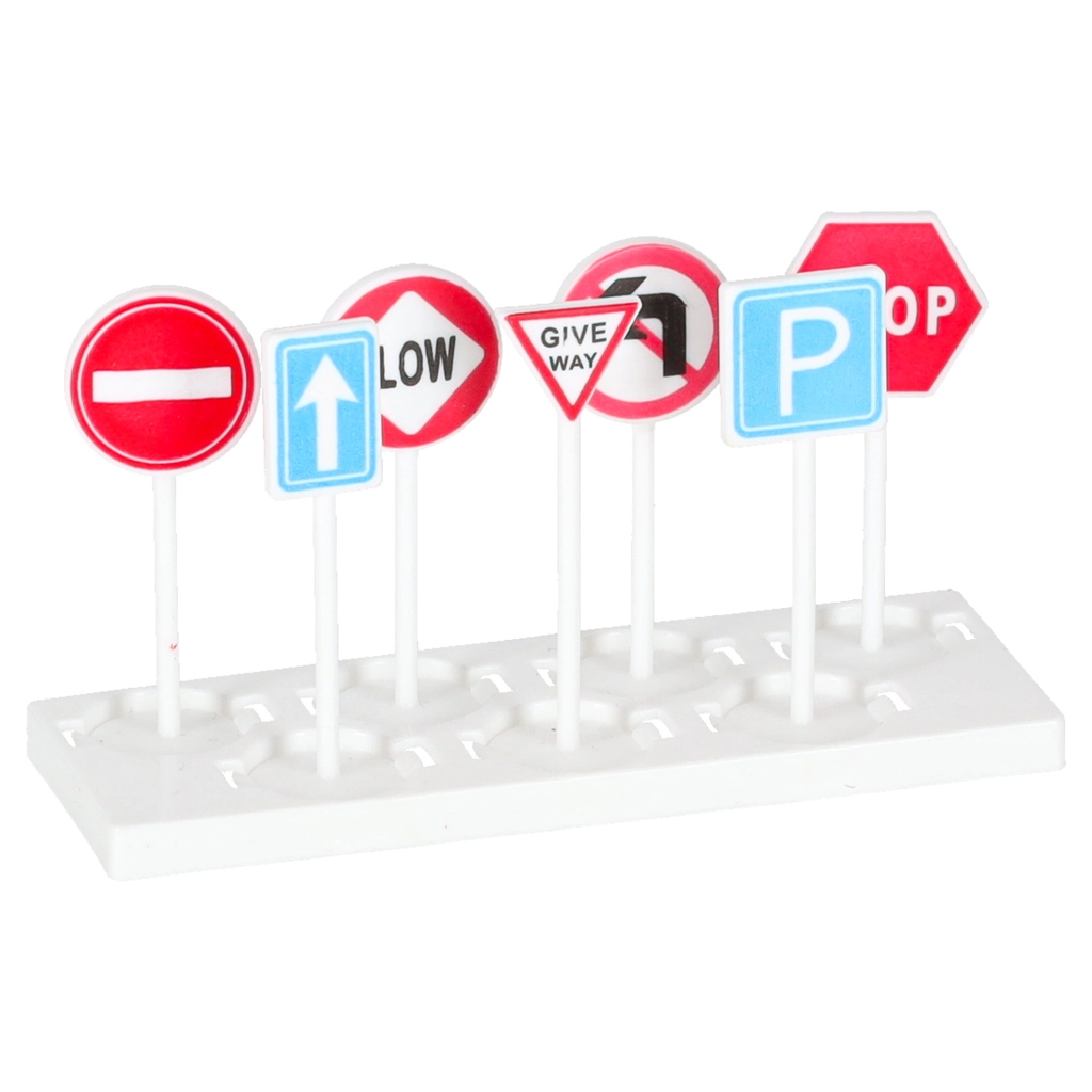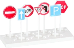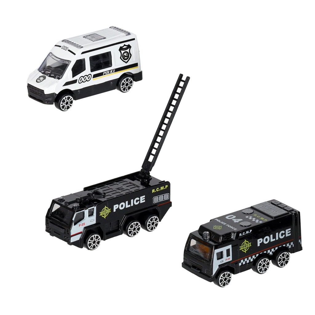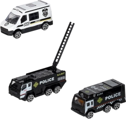 Komplektā ir 3 daļu policijas transportlīdzekļu komplekts un 7 ceļa zīmes. Bērni trenēs satiksmes noteikumus un komandas darbu.