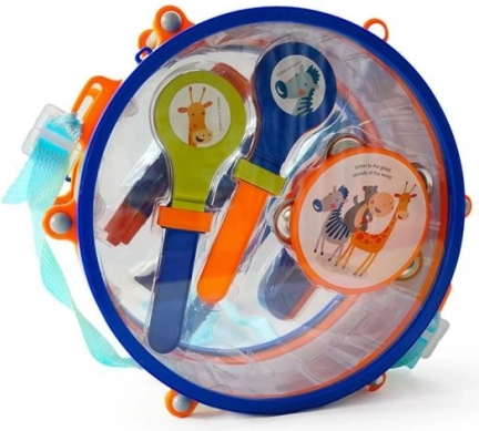 Komplektā ir bungas ar vālītēm, tamburīns, marakasi, flauta un citi grabuļi – viss košās krāsās rotaļīgai mācībai.