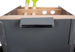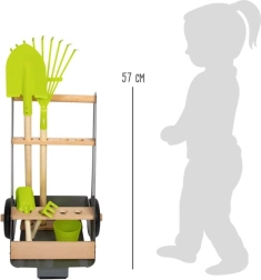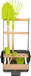 Šie dārza ratiņi ļauj jaunajiem dārzniekiem strādāt pie sava sapņu dobes. Stabilos ratiņus no dižskābarža koka un metāla, pateicoties izturīgiem riteņiem, var viegli stumt vai vilkt pa dārzu. Komplektā ir 5 darbarīku gabali drošai un jautrai dārzkopībai.