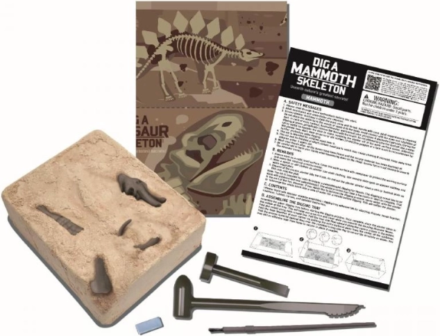 Šis interaktīvais izrakumu komplekts pārvērtīs jūsu galdu par nelielu paleontoloģisko atradni. Ar iekļauto kaltiņu un otiņu bērni uzmanīgi atsedz atsevišķus kaulus un pēc tam no tiem saliek detalizētu mamuta skeleta modeli. Izklaide apvienojas ar mācīšanos, un rezultātā top iespaidīgs eksponāts bērnu istabai.