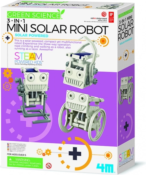 Konstruktors Saules roboti 3 vienā no 4M ir ideāls mazajiem pētniekiem no 8 gadiem. Bērni praksē iepazīs, kā darbojas saules piedziņa, apgūs mehānikas pamatus un, saliekot modeļus, trenēs pacietību un sīko motoriku. Gatavie modeļi kustas tiešos saules staros vai zem spēcīga gaismas avota.