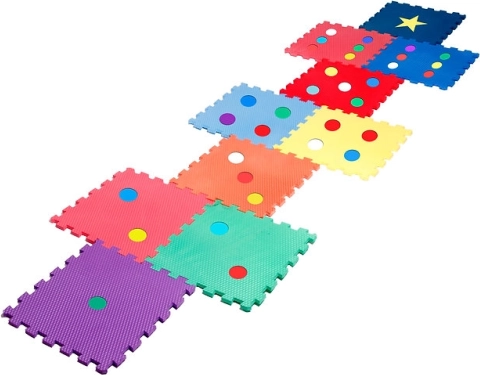 Košas krāsas un formas (punktiņi, zvaigzne) veicina sensoru uztveri un gan sīkās, gan lielās motorikas attīstību. Putas slāpē triecienus un aizsargā no grīdas aukstuma.