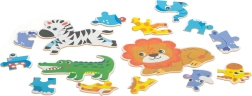 Šī radošā puzle ar dzīvniekiem, piemēram, žirafi, lauvu, zebru un krokodilu, attīsta bērnu iztēli un veicina koncentrēšanos. Pateicoties krāsainām ilustrācijām un lielākiem gabaliņiem, bērni apgūst loģisko domāšanu, sīko motoriku un pacietību.