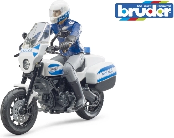Policijas motocikls DUCATI Scrambler no Bruder ir izstrādāts modelis gan maziem, gan lieliem glābšanas dienestu cienītājiem. Motociklam ir grozāma stūre ērtai manevrēšanai un nolokāma atbalsta kāja stabilai novietošanai. Policista figūrai ir kustīgas locekļu locītavas, tāpēc to var iesēdināt braukšanas pozīcijā vai novietot blakus motociklam.