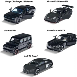 Atklājiet kolekcionāru komplektu Majorette Black Edition ar pieciem metāla automašīnu modeļiem mērogā 1:64. Elegantas melnās krāsas kolekcijā iekļauti ikoniski auto kā AUDI R8, BRABUS B63, NISSAN GT3 NISMO GTR, DODGE DEMON un Mercedes-AMG GTR. Dažiem modeļiem ir atveramas daļas, un visus izceļ detalizēts izpildījums un brīvgaitas riteņi – lieliski gan spēlēšanai, gan izstādīšanai.