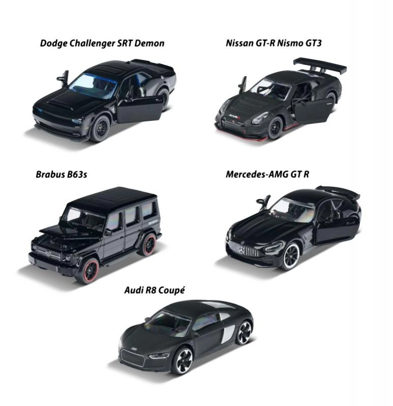 Komplektā atradīsiet AUDI R8, BRABUS B63, NISSAN GT3 NISMO GTR, DODGE DEMON un Mercedes-AMG GTR – izlase, kas iepriecinās ikvienu auto cienītāju.