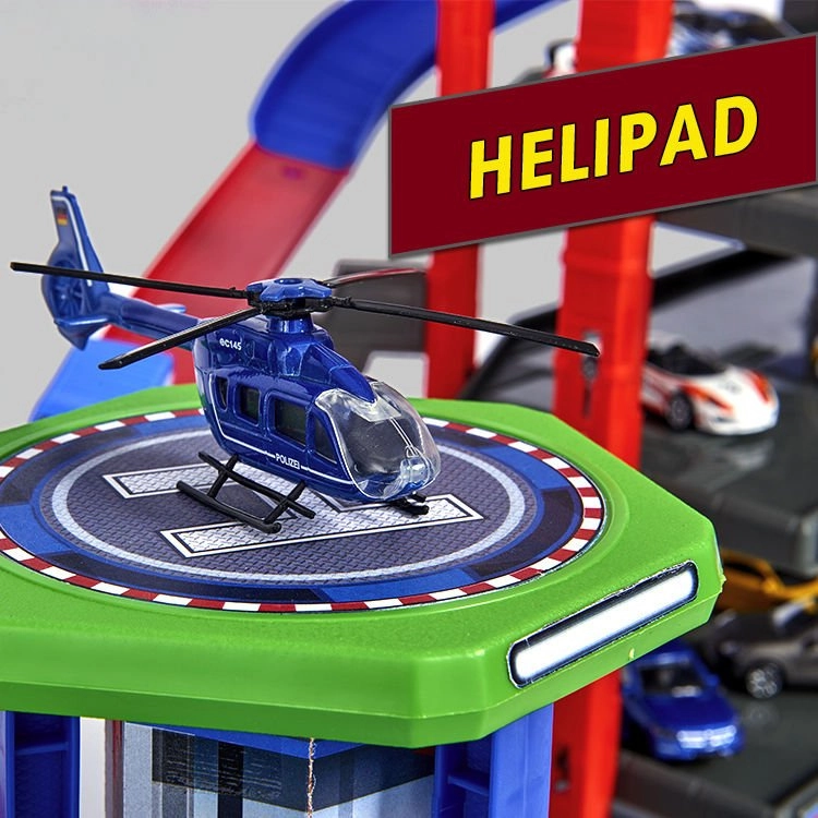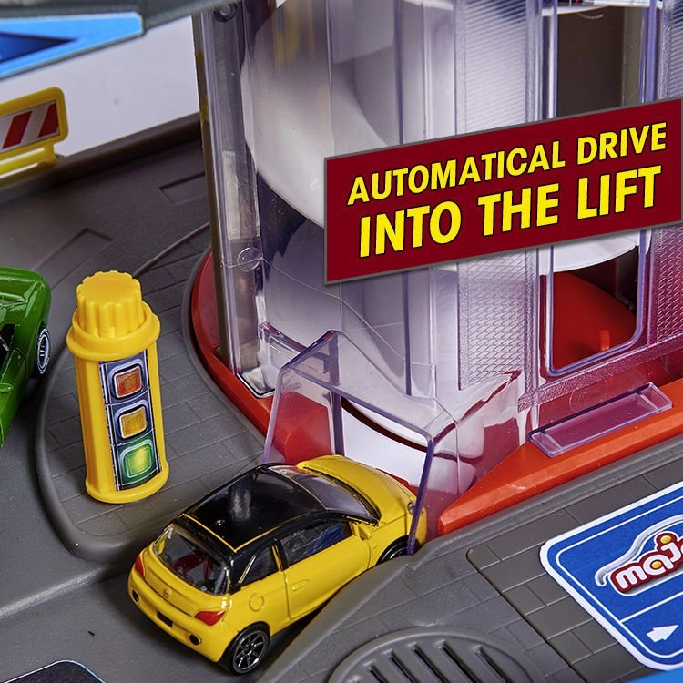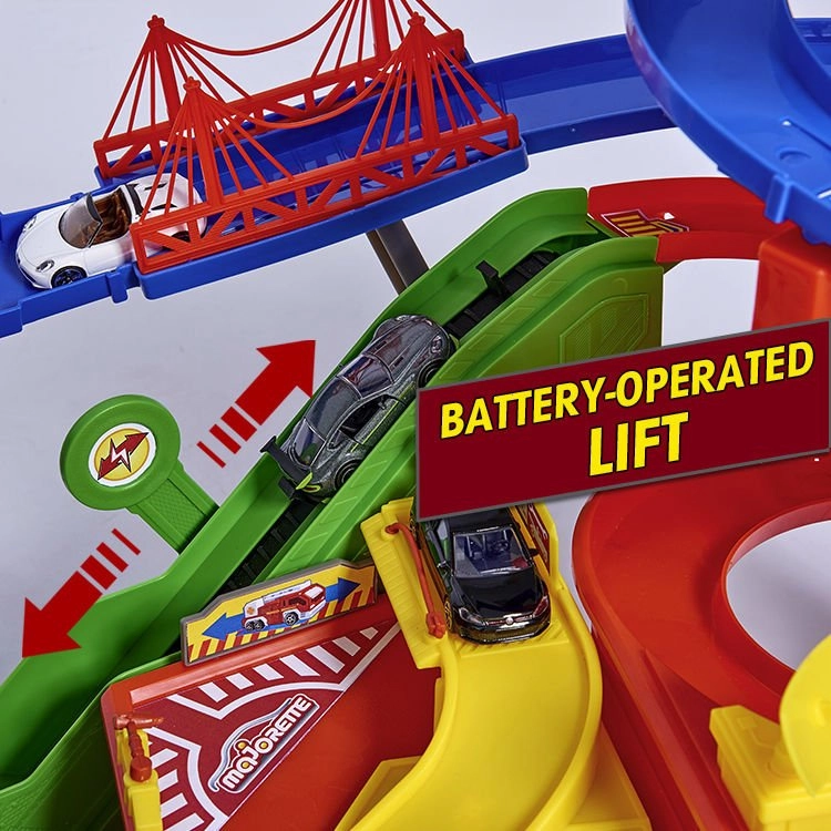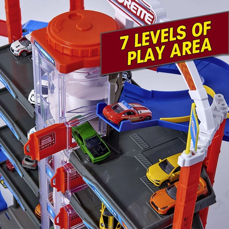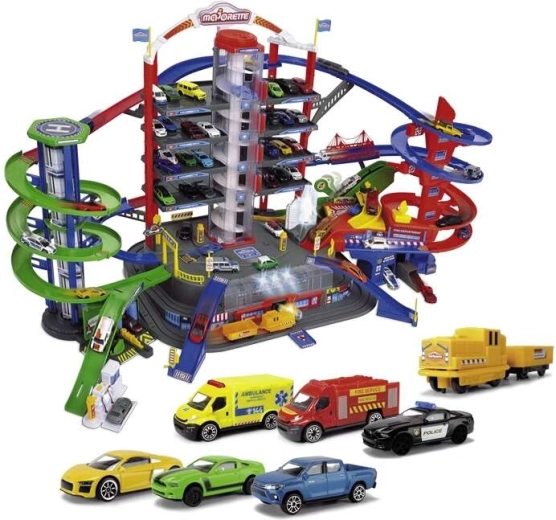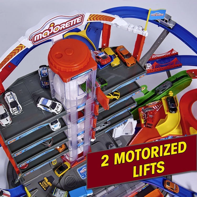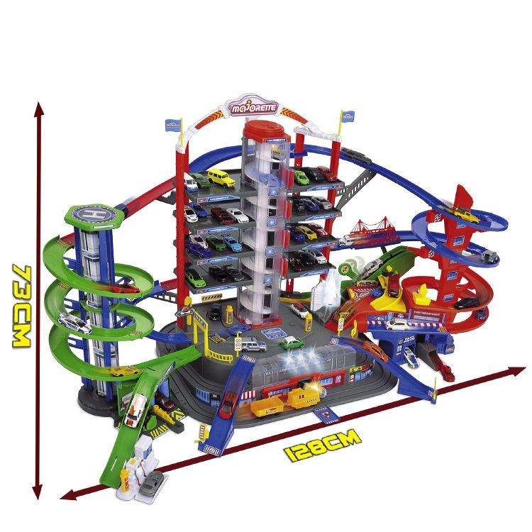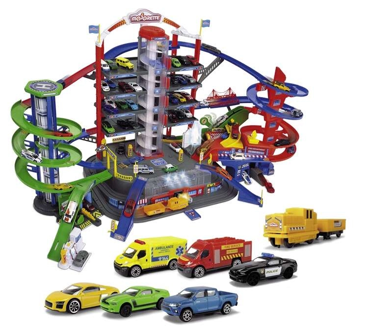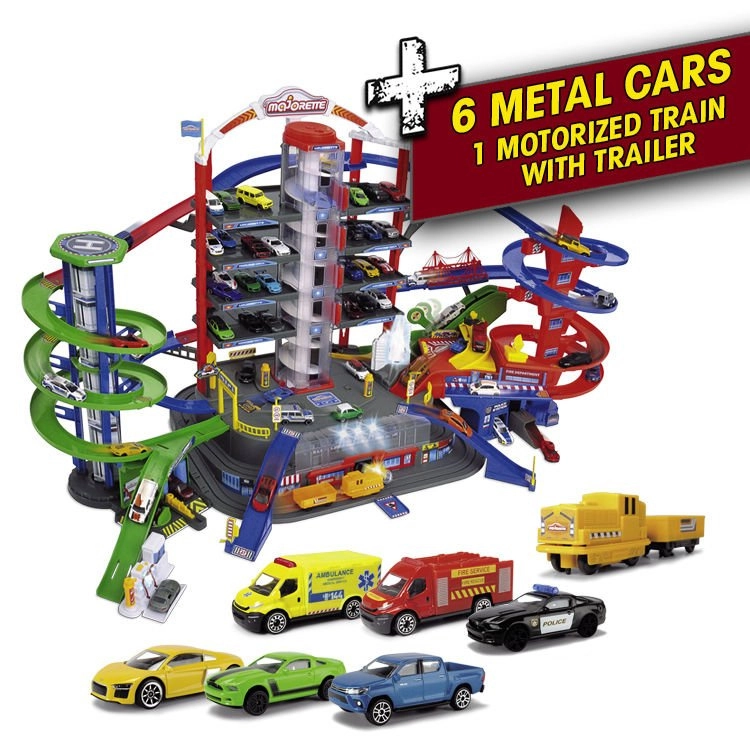 Šis lielais garāžas komplekts bērniem piedāvā bezgalīgas spēļu iespējas septiņu stāvu platībā. Krāsainas spirāliskās trases, ar baterijām darbināms lifts un reālistiski gaismas un skaņas efekti iepriecinās ikvienu mazo auto un vilcienu entuziastu. Metāla mazauto ar brīvi ritošiem riteņiem vienmērīgi slīd pa rampām, kamēr lokomotīve ar vagonu traucas caur slepenu tuneli un piestāj dzelzceļa stacijā.