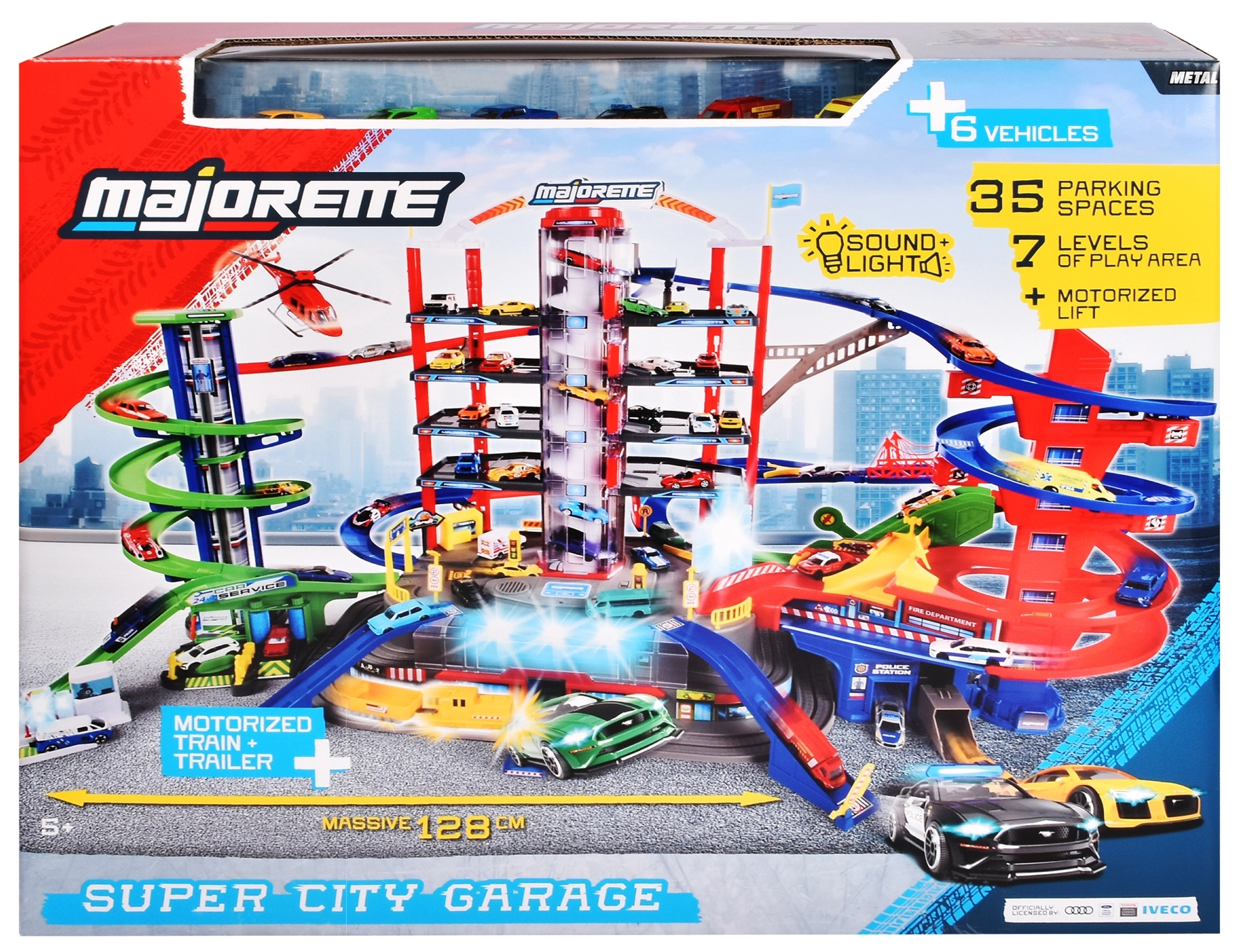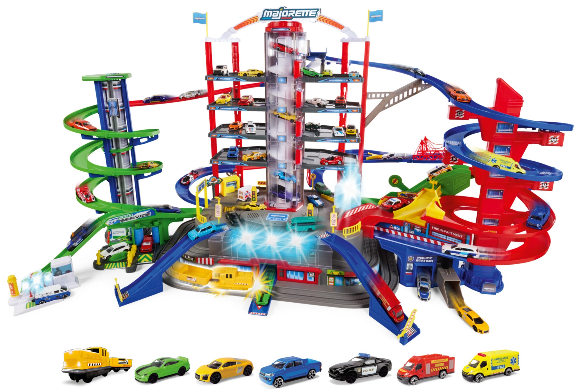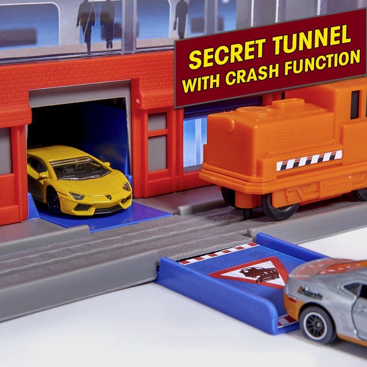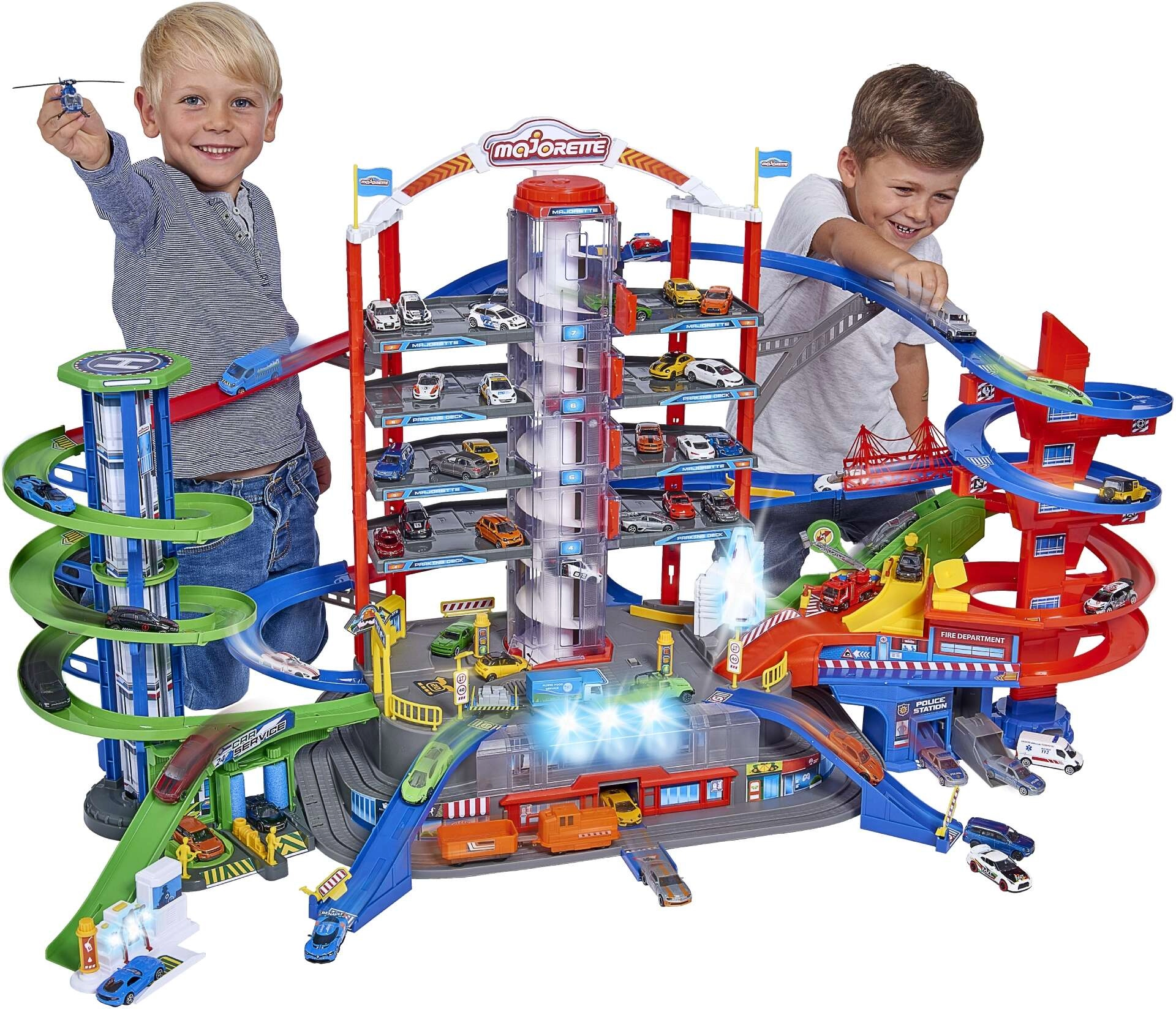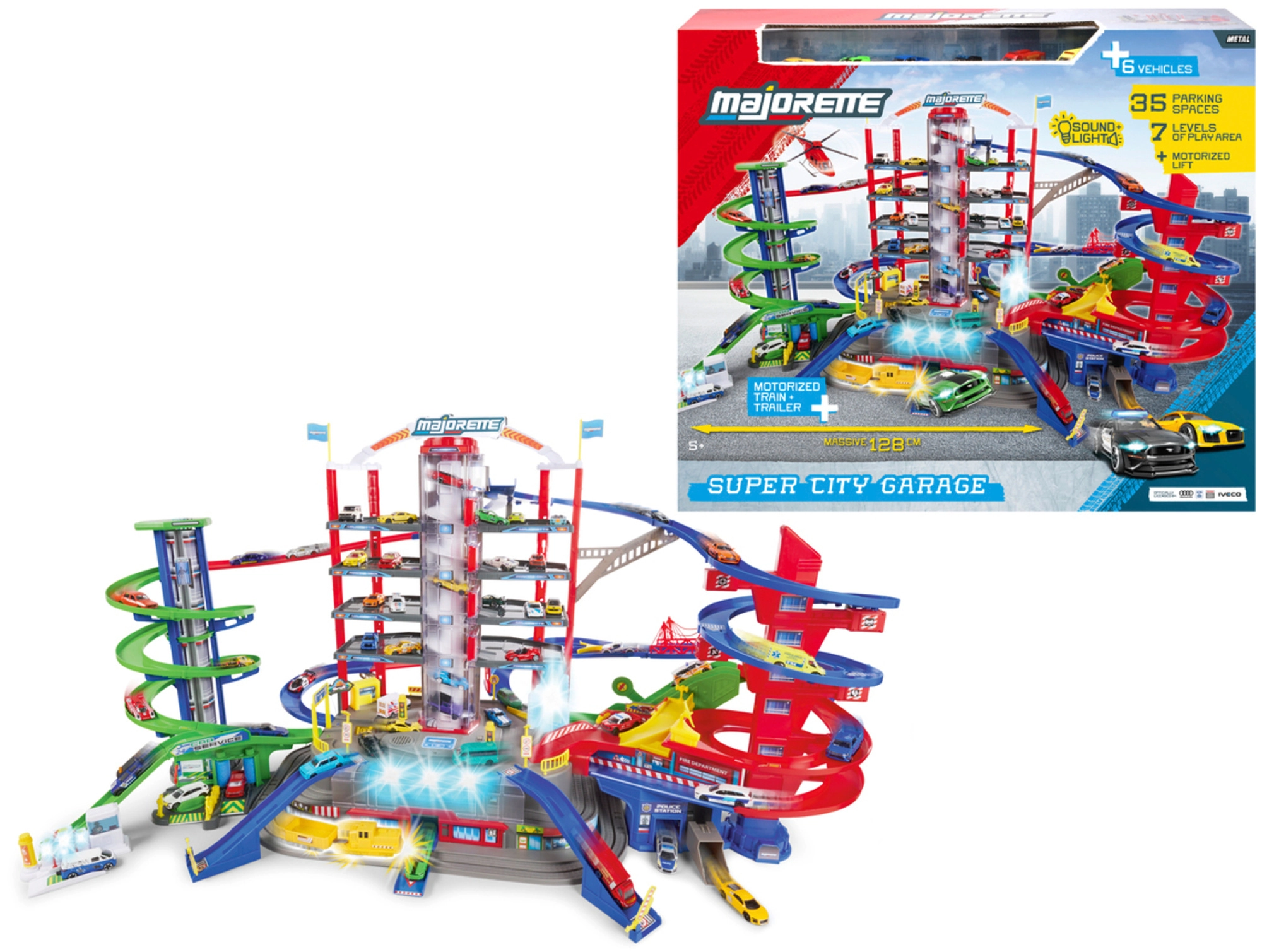 Šis lielais garāžas komplekts bērniem piedāvā bezgalīgas spēļu iespējas septiņu stāvu platībā. Krāsainas spirāliskās trases, ar baterijām darbināms lifts un reālistiski gaismas un skaņas efekti iepriecinās ikvienu mazo auto un vilcienu entuziastu. Metāla mazauto ar brīvi ritošiem riteņiem vienmērīgi slīd pa rampām, kamēr lokomotīve ar vagonu traucas caur slepenu tuneli un piestāj dzelzceļa stacijā.