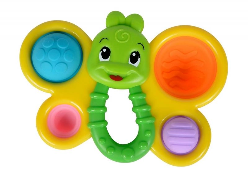 Šis vieglais un drošais tauriņa formas grabulis ir radīts mazām bērnu rociņām. Krāsainie spārni ar dažādām virsmām aicina izpētīt, grabinošie elementi stimulē dzirdi, bet ērtais rokturis atvieglo satveršanu un patstāvīgu rotaļu.