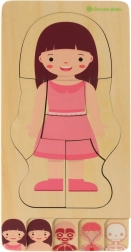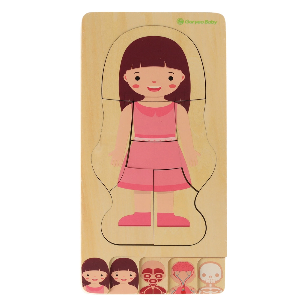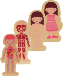 Šī kvalitatīvā koka puzle mudina bērnus atklāt, kā ir veidots cilvēks. Mazie pētnieki kārto slāņus šādā secībā: skelets → orgāni → muskuļi → ķermenis → apģērbs. Tādējādi top uzskatāms cilvēka ķermeņa attēls, kas veicina zinātkāri un dabisku mācīšanos bez spiediena.