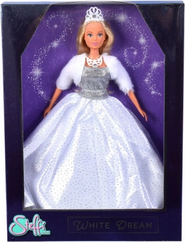 Ļaujiet iztēlei mirdzēt ar lelli STEFFI LOVE – Baltais sapnis. Tā apbur ar skaistu baltu mirdzošu kleitu, maigu mākslīgās kažokādas bolero un stilīgiem aksesuāriem. Šī princese iedvesmo stāstiem, kas pilni elegances un prieka, un veicina radošas lomspēles.