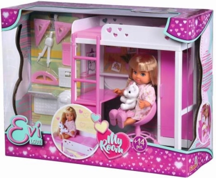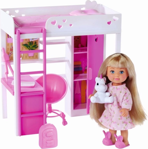 Atklājiet burvīgu istabiņu, kur lellīte Evi pavada laiku spēlējoties, mācoties un atpūšoties. Modernā lofta gulta ar kāpnēm taupa vietu, bet zem tās paslēpts ērts darba stūrītis ar rakstāmgaldu un glabāšanas vietu. Viss saskaņots baltrozā gammā ar maigām sirsniņām – īsts prieks ikvienai mazai dizainerei.