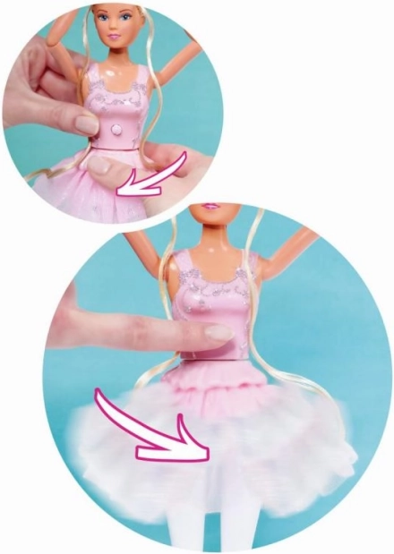 Atklājiet baleta burvību ar lelli Steffi Love – dejojoša balerīna. Tai ir griezoša tilla svārciņa funkcija ar rožu formas pogu, kustīgas rokas elkoņos un plaukstas locītavās graciozām pozām, un komplektā ir arī mīļš trusītis svārciņos. Ideāli piemērota radošai spēlei un dejas mīļotājām.